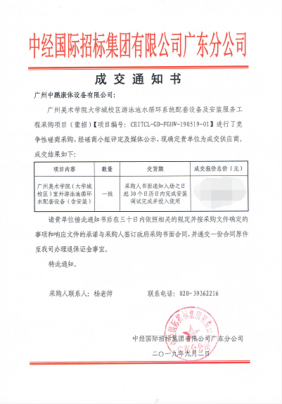 2019年9月2日,在這天從中經(jīng)國際招標(biāo)集團(tuán)有限公司獲悉,經(jīng)過激烈競標(biāo),我司以絕對的優(yōu)勢中得廣州美術(shù)學(xué)院大學(xué)城校區(qū)游泳池水循環(huán)系統(tǒng)配套設(shè)備及安裝服務(wù)工程。